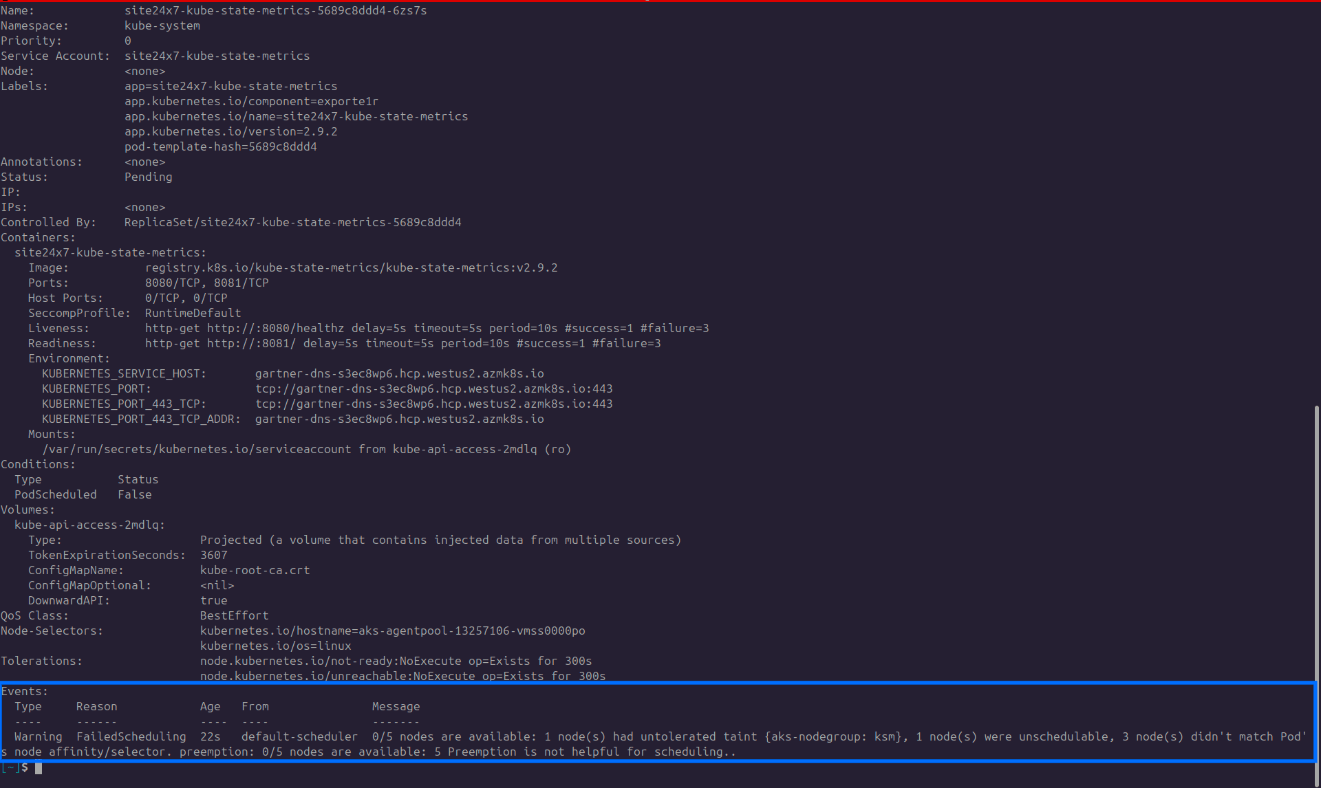 The screenshot above states that the pod is unable to schedule because there is a taint configuration.