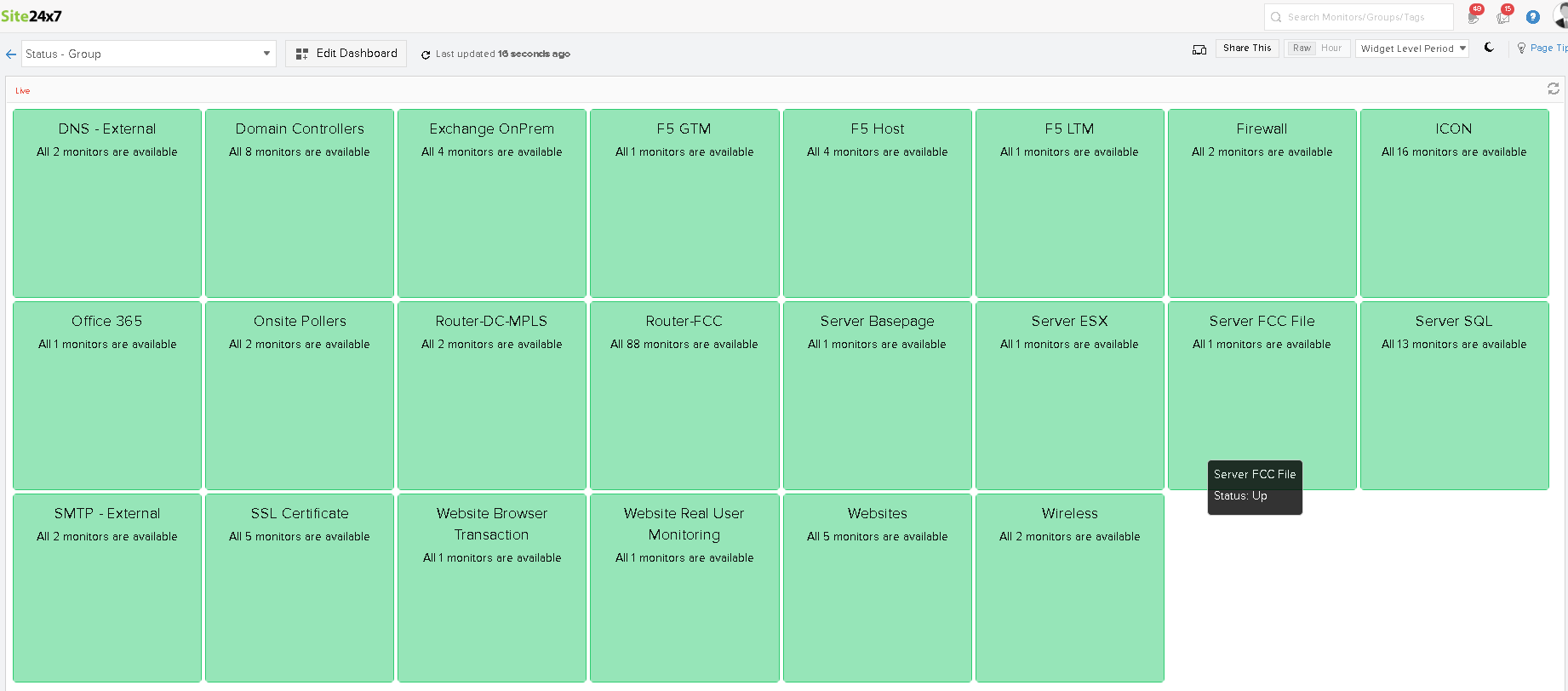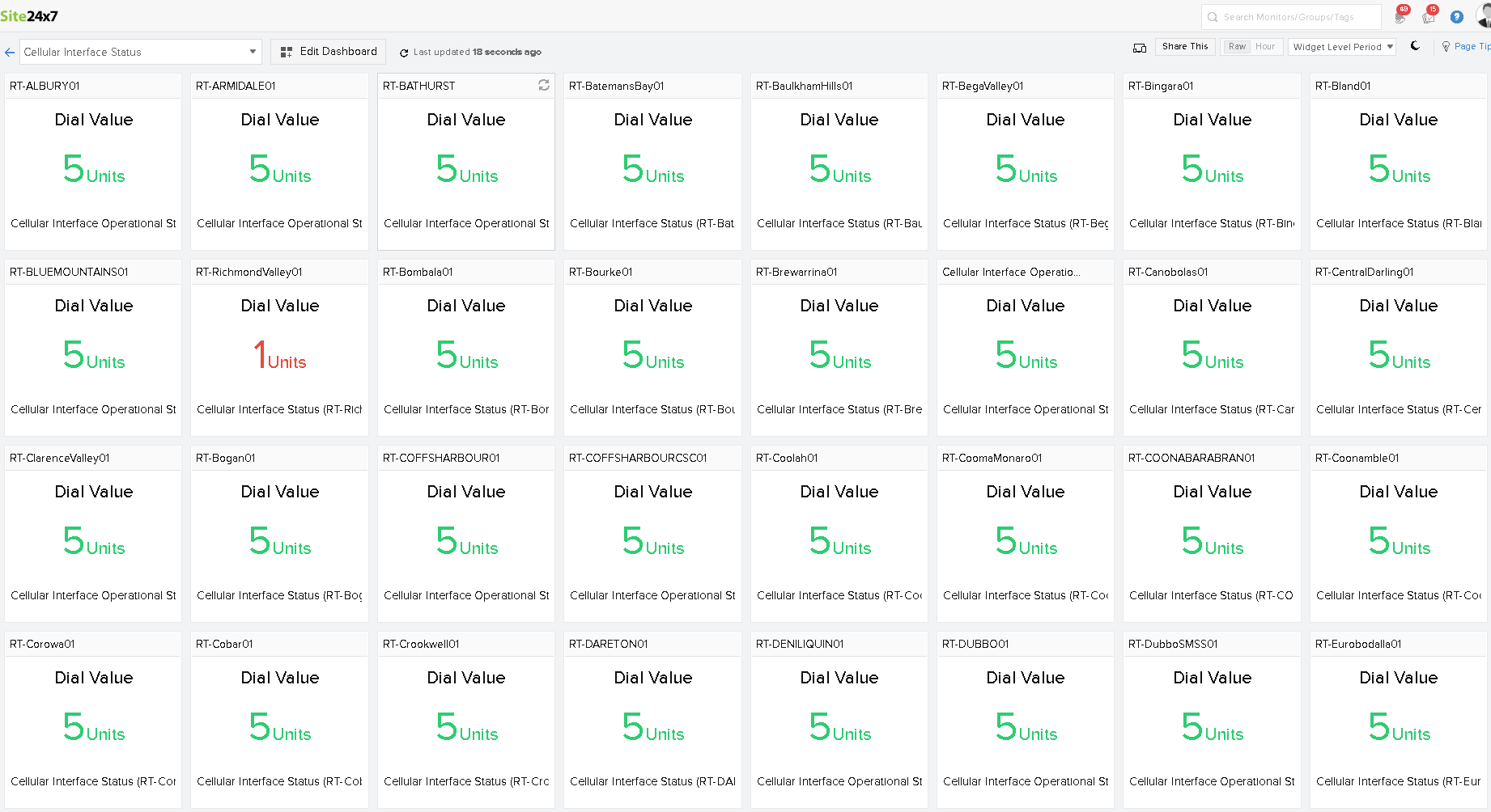I am using a custom dashboard to display the status of a performance counter for all my routers. It shows me whether a router has failed over to a backup link or not. If the performance counter value is 5 (green), its normal and if its 1 (red) then its failed over to the cellular link. I have about 100 routers. Its very clumsy and very laborious to create such a dashboard. Needs lots of refinement. I have attached the screenshot of my dashboard and see how ugly it looks.