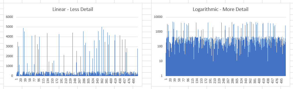 Please provide logarithmic scales on graphs/charts to better display data with outlier values that skew the Y-axis scale and "crush" normal samples into a small vertical space. Please see picture for example, the same data is displayed in both graphs.