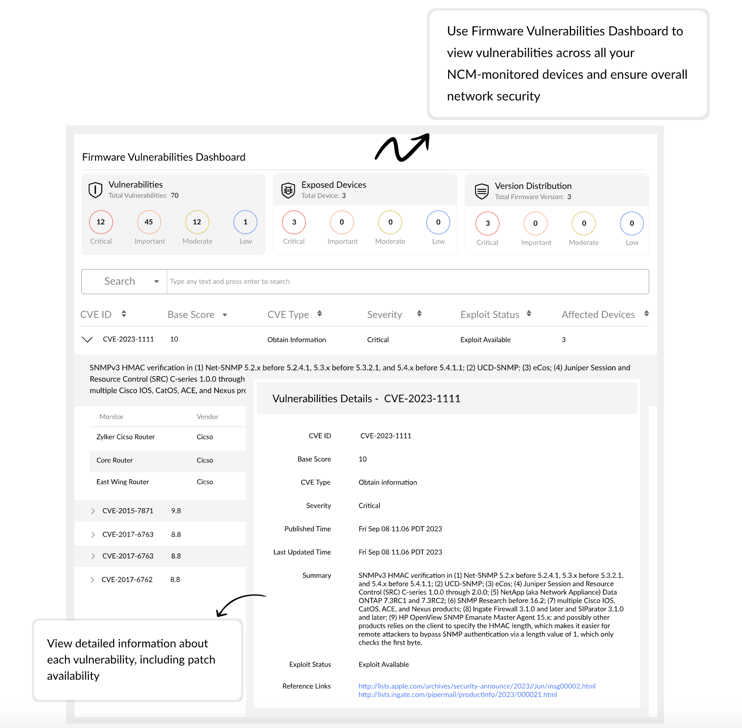 Site24x7's NCM sends proactive alerts whenever a firmware vulnerability is identified. The Firmware Vulnerabilities Dashboard displays the firmware versions, the number of exposed devices, and the list of vulnerabilities. You can click on any vulnerability to check if a patch is available and check the reference links displayed on the screen to understand how to protect your device against the vulnerability. This minimizes security threats in your network devices and safeguards them against possible exploits.