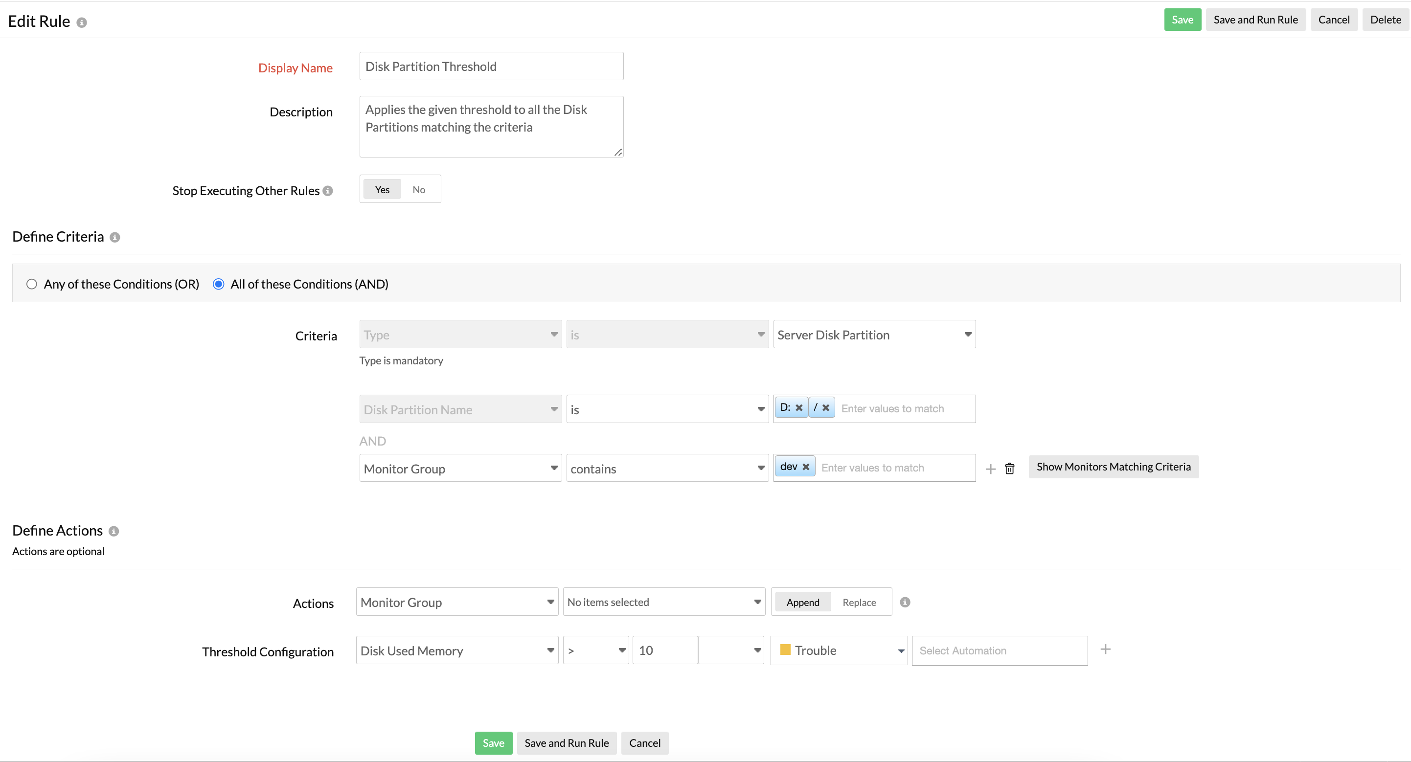Select Disk Used Memory from the Threshold Configuration dropdown and save and run the Rule to apply the threshold to all the existing Partitions matching the criteria - Save your changes.