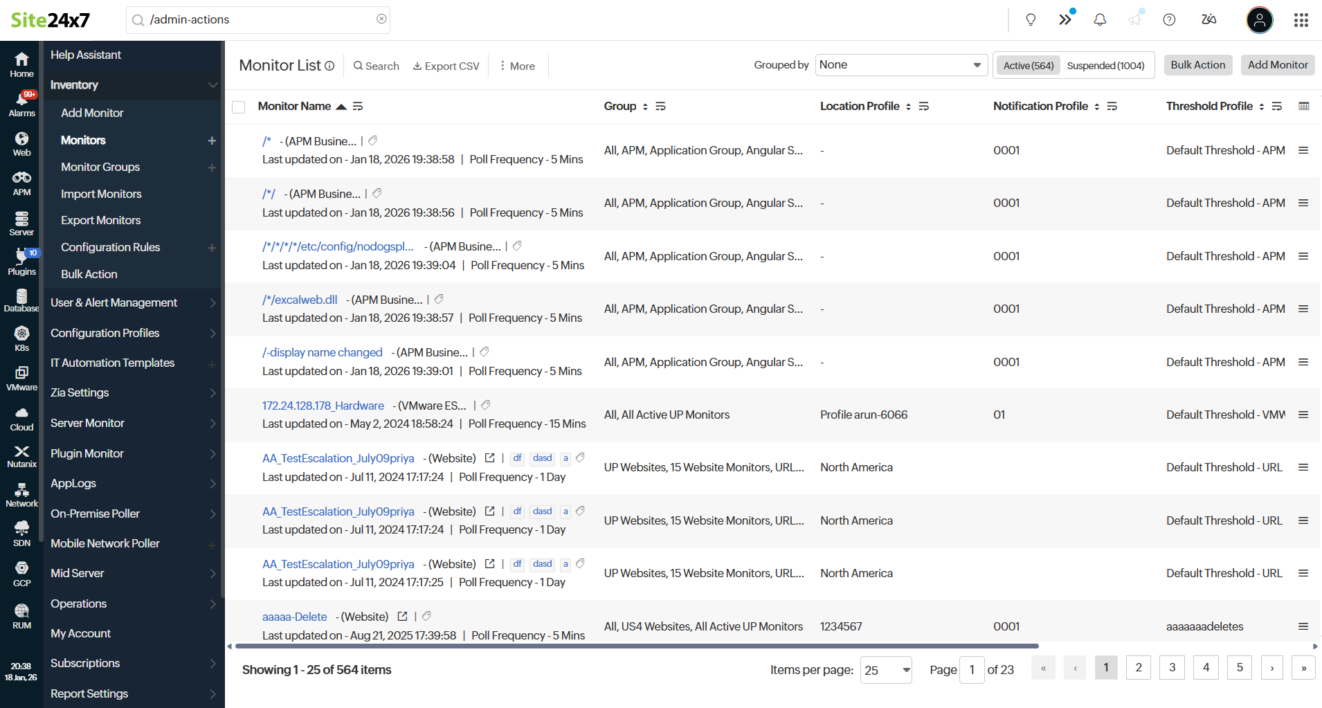 - Login to Site24x7 and navigate to Admin > Inventory > Monitors.