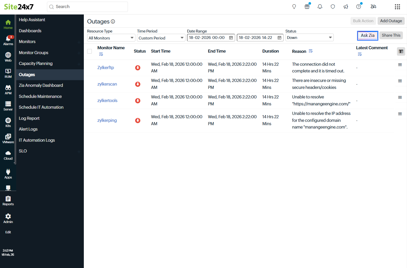 - You can also retrieve outage history for a specific monitor. For example, for a prompt: Show me the recent outages for @monitor-name in the last 7 days, Zia lists the outages within the specified period, including outage start time, end time, total duration, and reason for downtime (if available).
