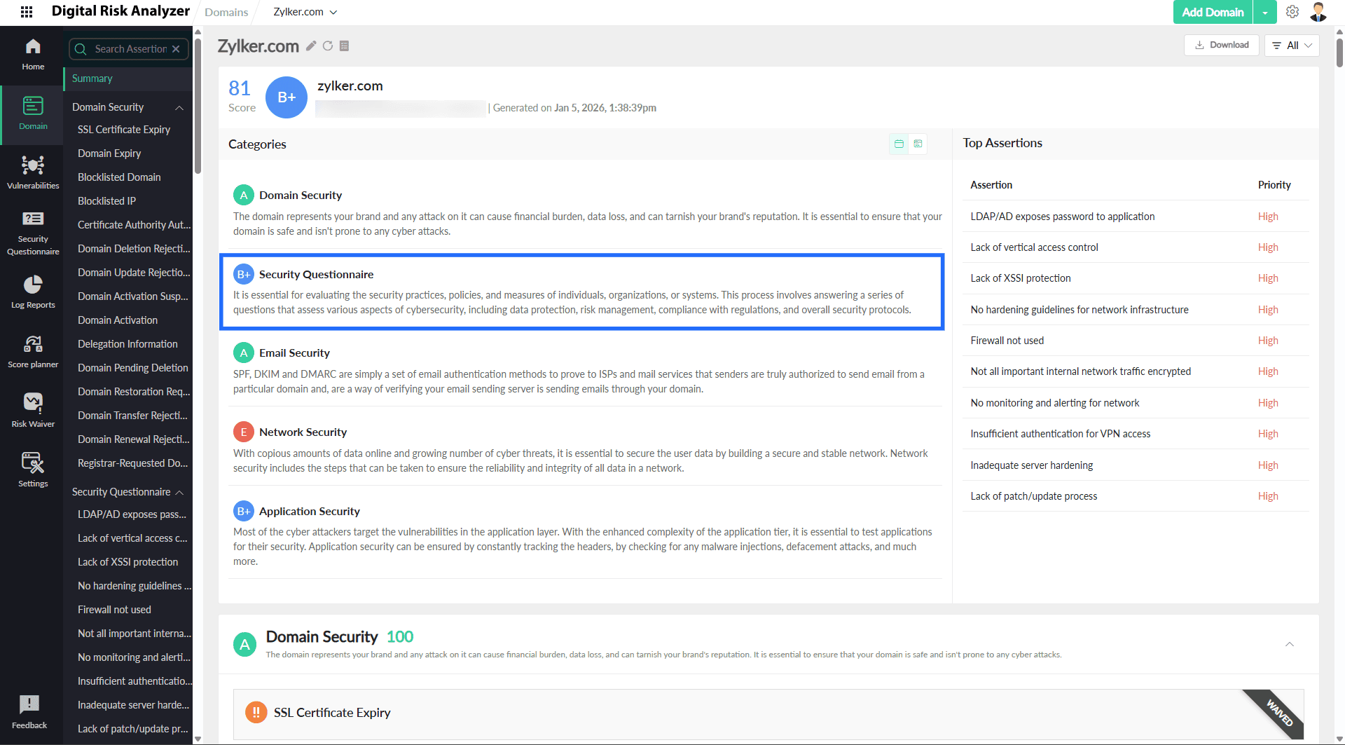 - Click the vendor domain you want to assess using the Security Questionnaire.